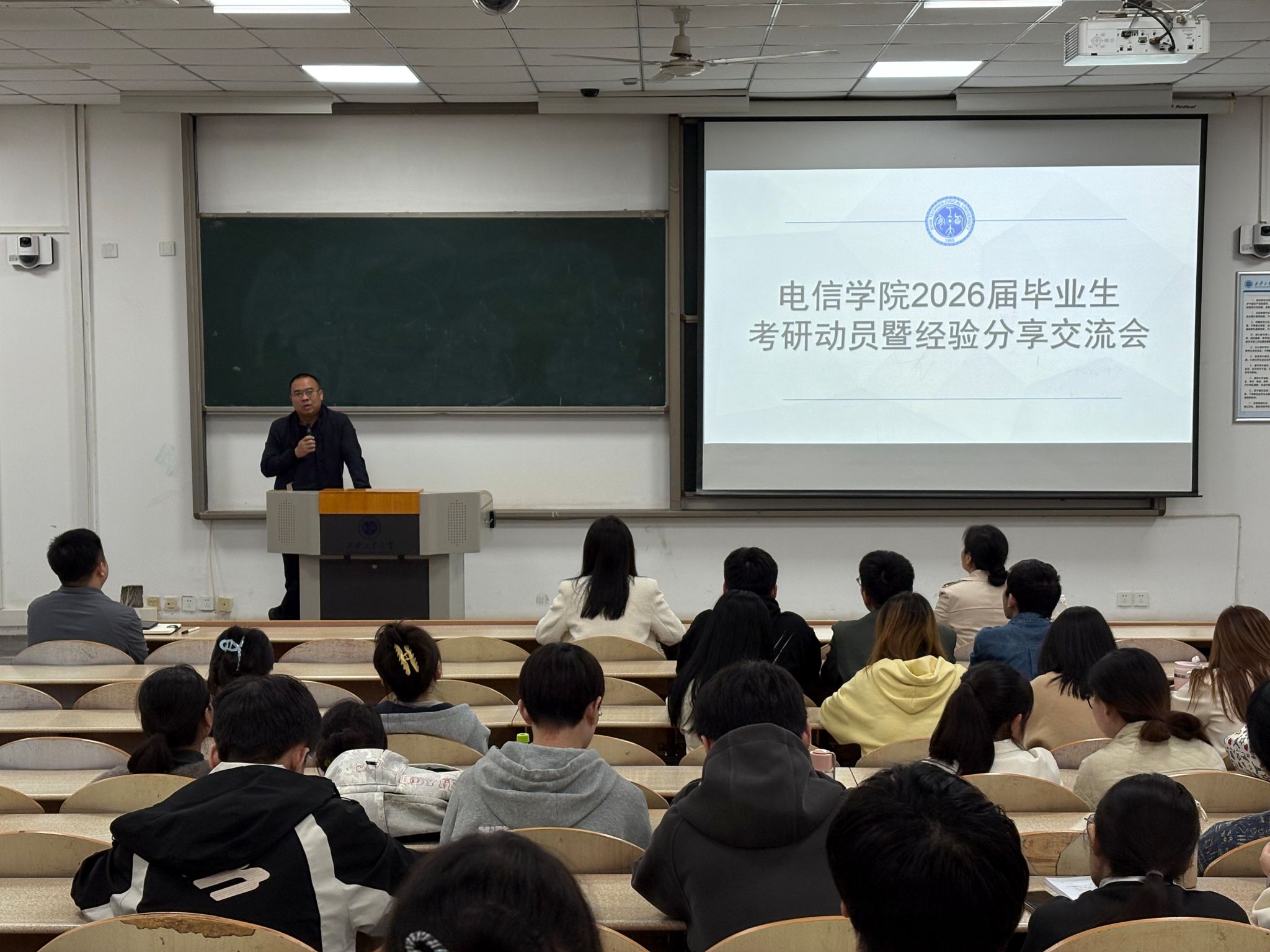 于10月15日晚在教1-103召开考研动员暨经验分享交流会。学院党委副书记王利军及2026届毕业生、辅导员参会,会议由学院学工办主任何鹏程主持。