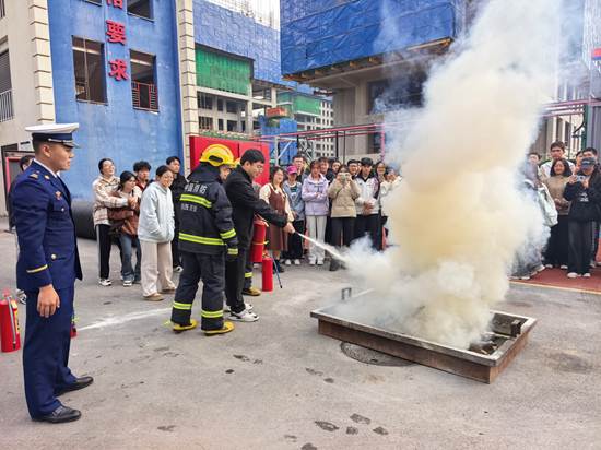 此外,现场还进行了实用绳结教学,李伟华手把手指导学生学习单结、双结、八字结等编织技巧,并详细讲解不同绳结在救援、逃生场景中的应用方法,让大家掌握了多项应急自救技能。灭火器实操环节,在消防官兵的专业指导下,学生们严格遵循“提、拔、握、压”的操作步骤,亲身参与灭火演练,掌握了小型火灾的扑救方法及灭火器使用要点,进一步夯实了消防安全技能基础。