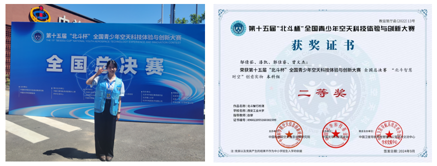 2024年8月22日,第十五届“北斗杯”全国青少年空天科技体验与创新大赛全国总决赛在北京怀柔隆重开幕。“北斗杯”全国青少年科技创新大赛由教育部科学技术司、共青团中央等单位共同主办,是我国青少年科技教育领域的一项重要赛事,旨在激发青少年对科技创新的兴趣,培养北斗创新人才。第十五届“北斗杯”大赛面向全国29个省级赛区开展,共有66637组参赛队伍、44630份作品、12万余名师生积极参与。在全国总决赛中,我校由邬倩茹、漆凯、郭佳睿、曾文杰组队的作品“北斗智行检测”获得了国赛二等奖。