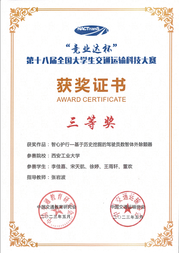 李佳嘉等5名本科生完成的项目《智能护行—基于历史挖掘的驾驶员数智体外除颤器》,斩获全国三等奖1项,是目前我校在交通运输领域国家级学科竞赛的最好成绩。