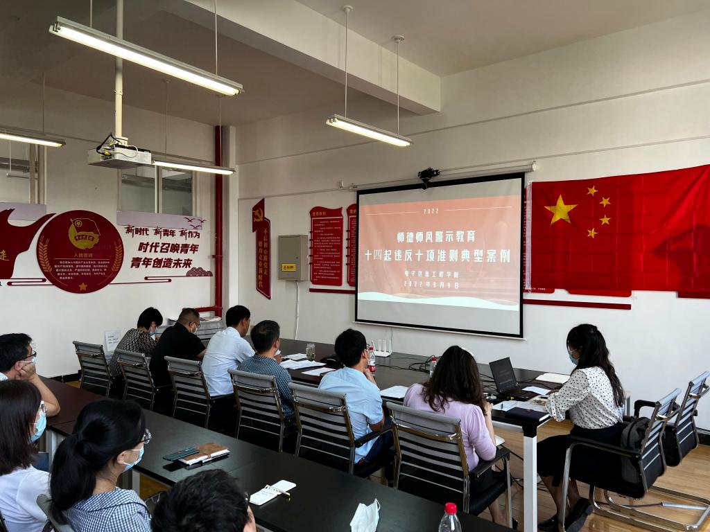 2022年“纪律教育学习宣传月”主活动方案》,就学院方案的贯彻落实做了动员部署。他带领与会者进一步深入学习了《新时代高校教师职业行为十项准则》、《西安工业大学师德失范行为处理办法(修订)》等高校师德师风结合相关规定,并结合“2022年教育部网站公布曝光的7起违反教师职业行为十项准则典型案例和陕西省教育厅办公室关于7起违反教师职业行为十项准则典型案例”开展了警示教育。他强调,全院教职工要以案为鉴,切实从师德失范的典型案例中汲取教训,对照新时代教师职业行为十项准则,自觉自省,防微杜渐,严防违反师德师风问题发生。