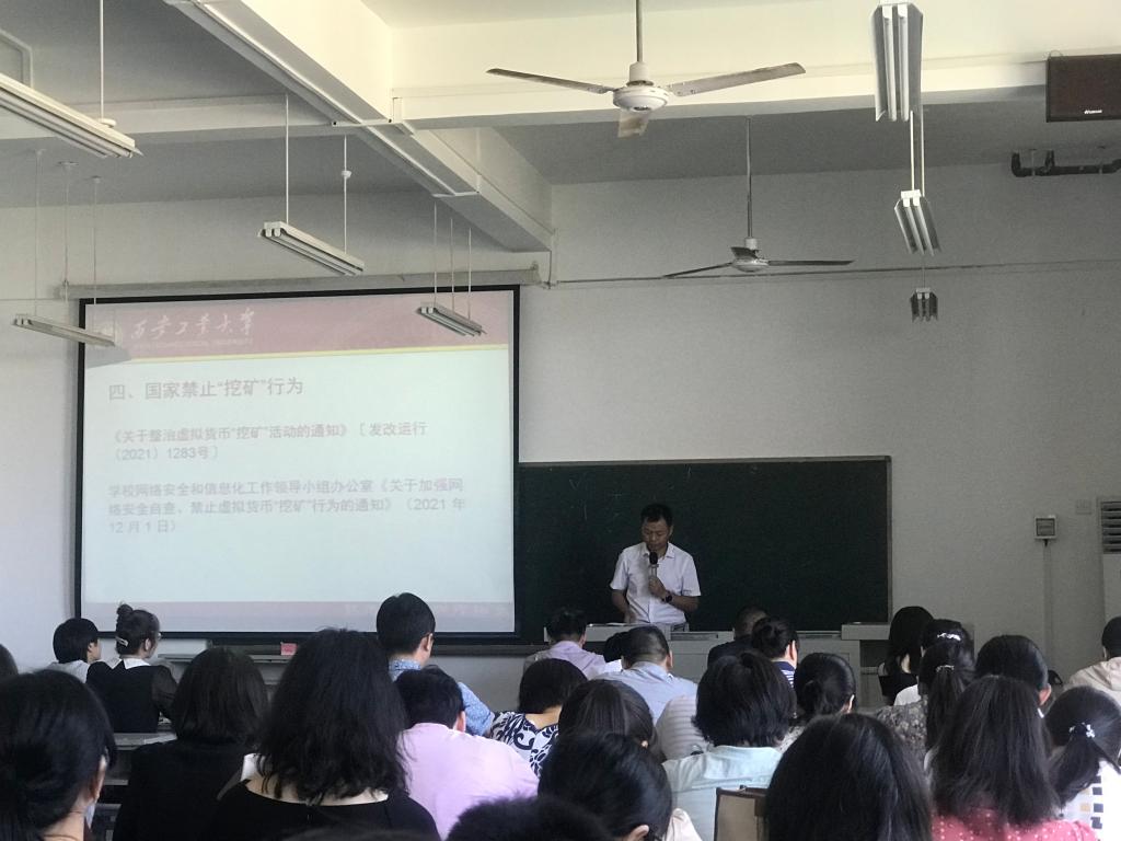 会上,易超以“远离‘挖矿’确保网络信息安全”为题,从什么是虚拟货币、什么是“挖矿”、“挖矿”的类型、国家禁止“挖矿”行为、“挖矿”行为危害、惩治虚拟货币“挖矿”行为等七个方面,向全体教职普及了“挖矿”的相关知识。