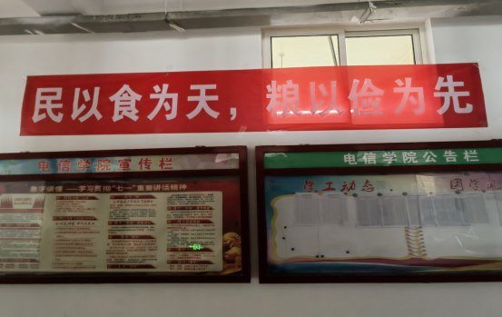 2022年10月16日,在第42个世界粮食日、全国粮食安全宣传周来临之际,为积极践行“保障粮食供给 端牢中国饭碗”的主题,培养学生爱粮节粮的意识,学院在显眼公共区域张贴横幅宣传语,面向学生开展“民以食为天,粮以俭为先”爱粮节粮活动,教育学生学习“爱粮节粮”知识,形成以“光盘行动”为荣,以“铺张浪费”为耻意识,弘扬勤俭节约的传统美德。