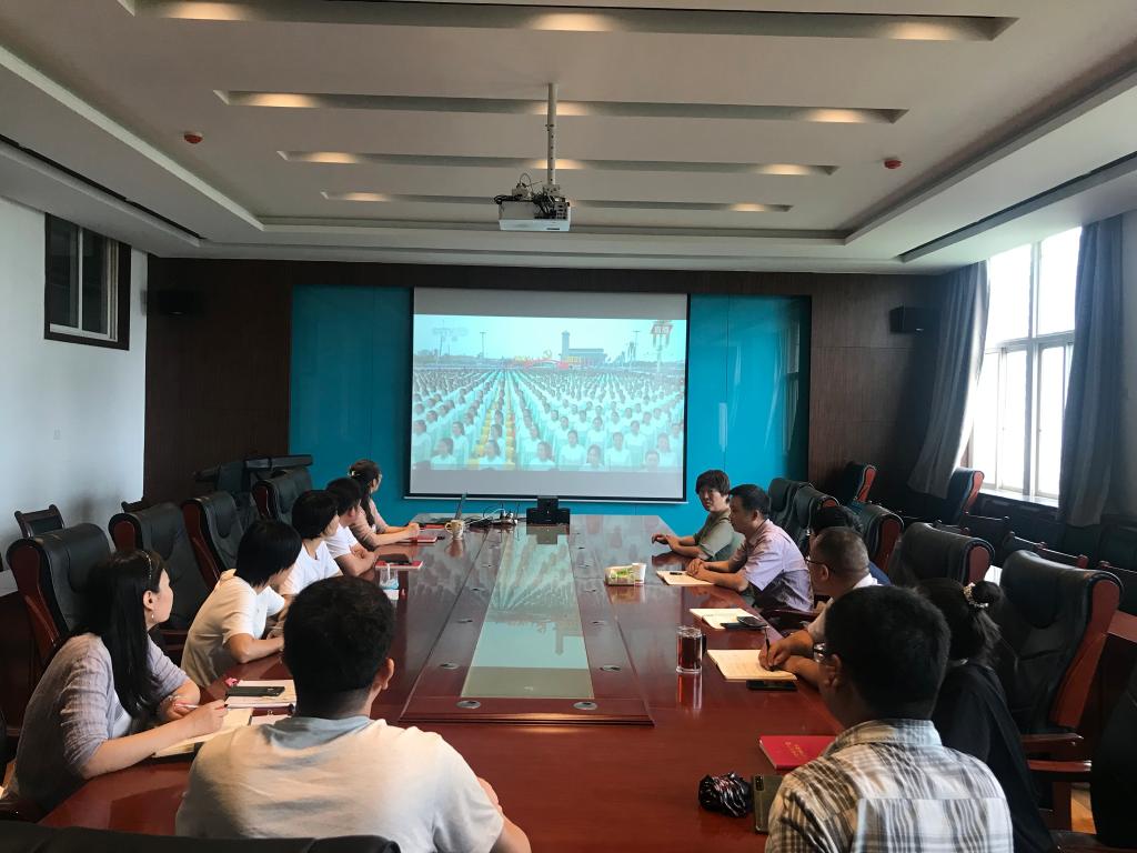 8时整,工5-406教室,一百余名师生庄重肃穆,整齐端坐,通过转播视频收看到仪仗官兵进入天安门广场,青少年组成的合唱团在天安门广场放声歌唱,空中护旗梯队拉开飞行庆祝表演序幕,100响礼炮响彻云霄,全场齐声高唱中华人民共和国国歌 五星红旗在天安门广场冉冉升起,各民主党派、工商联和无党派人士联合致贺词 万鄂湘宣读贺词,共青团员和少先队员代表集体致献词,中共中央总书记、国家主席、中央军委主席习近平发表的重要讲话。
