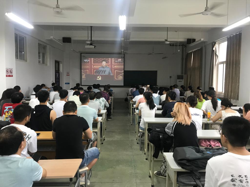 学院百余名师生参加收看实况转播,院党委中心组成员参加了研讨和慰问困难党员帮扶会议。