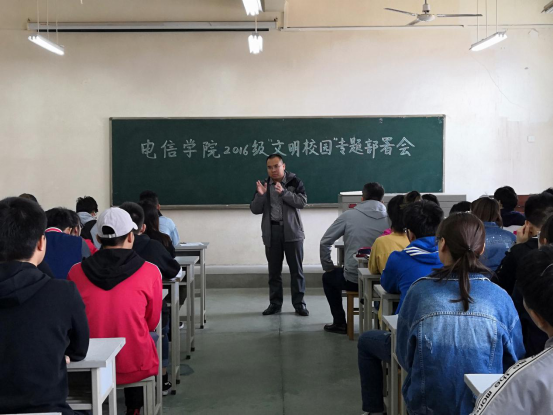 在工5-406教室组织召开2016级学生“文明校园”创建工作专题部署会。学院党委副书记王利军、辅导员张鹏出席会议,2016级各班长、支书以及全体学生党员100余人参加会议。